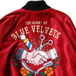 Tシャツで大変人気のあった、ブルーベルベッツとBLKのコラボシリーズのスカジャンです。とにかく圧巻の刺繍になっております!ここに掲載している以外の色での製作も可能です。黒リブから白リブへの変更も出来ますので、オリジナルカラーで製作したい!という方は、