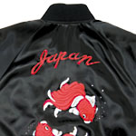 日本古来より神社の社殿に鎮座する一対の狛犬。それぞれ阿、吽の言葉を発する。ブラックサテンに白系の狛犬は大人の渋さを演出するにはもってこいのスカジャンです。